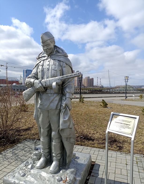 Как рассказал автор скульптуры, памятник посвящён ветеранам Великой Отечественной войны. Почти трёхметровый солдат стоит с автоматом ППШ в руке, склонив голову и закрыв глаза. В основании его – что-то вроде колючей проволоки: можно расценить это как освобождение пленных из концлагерей, а можно – как развалины.